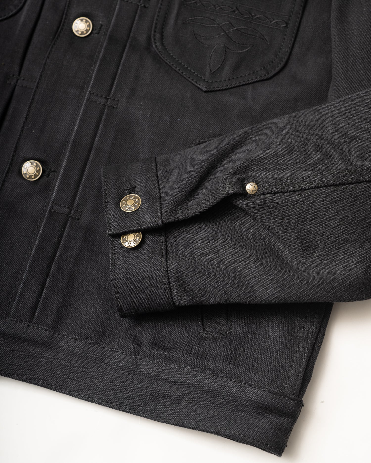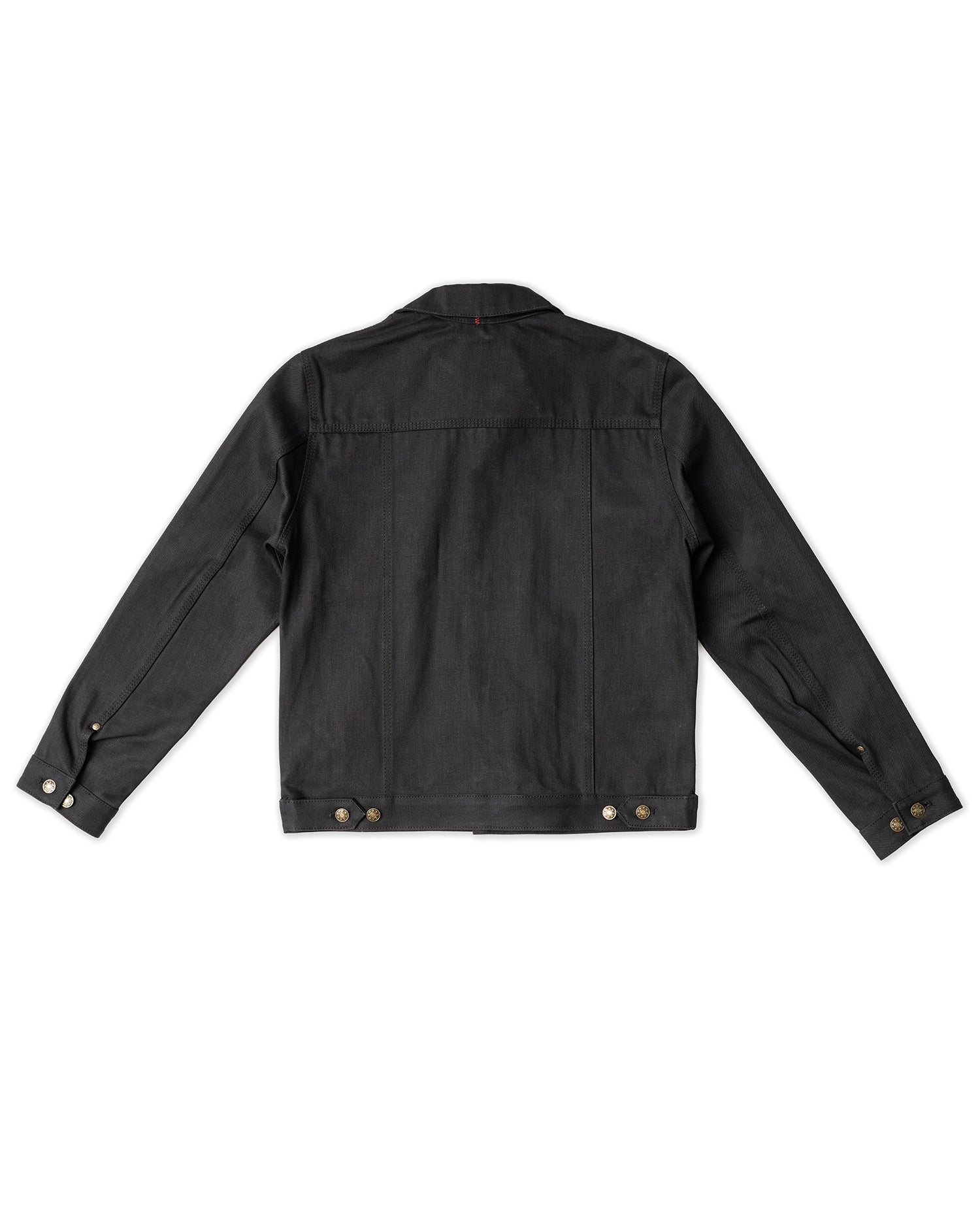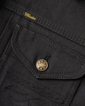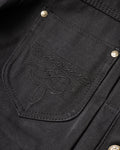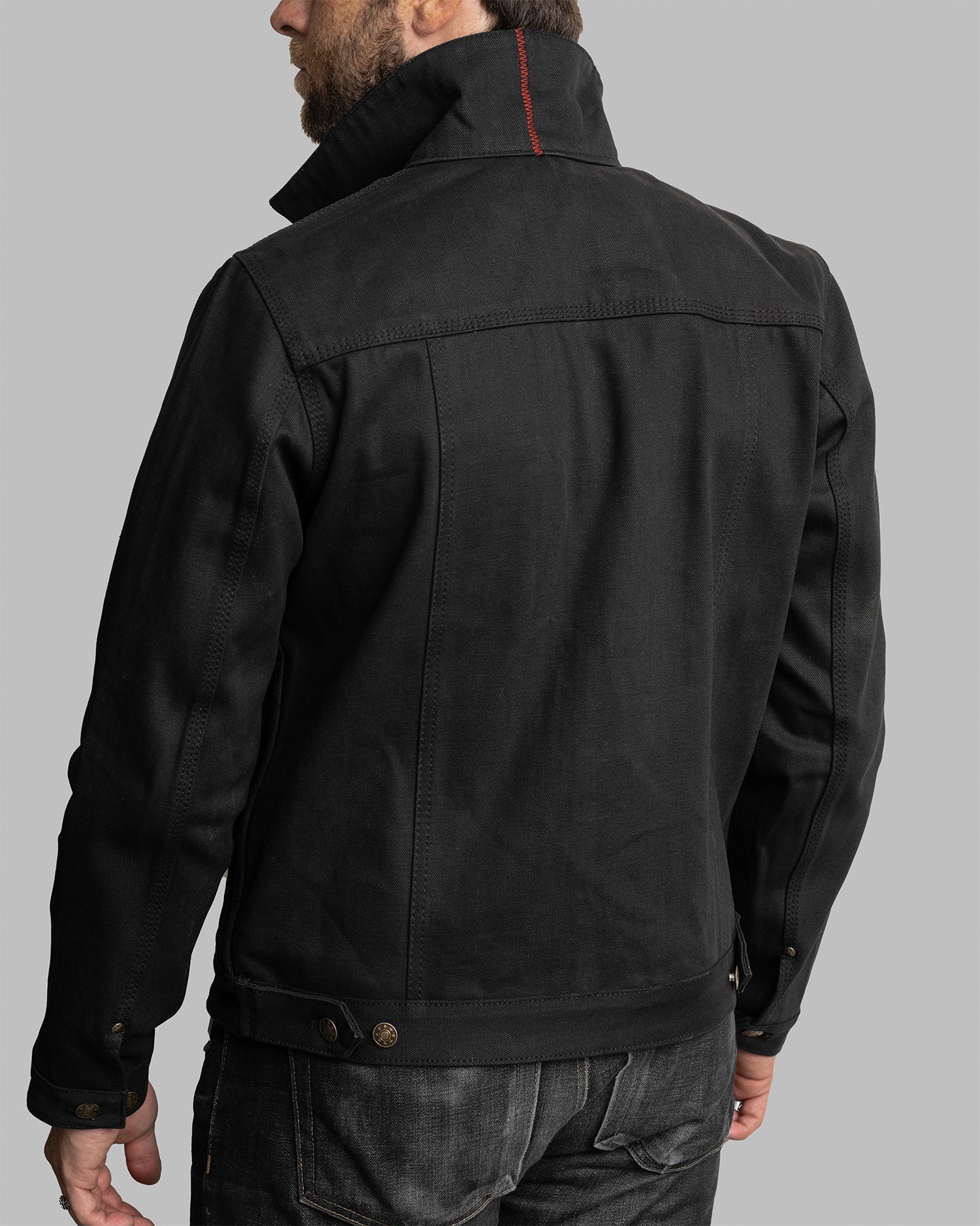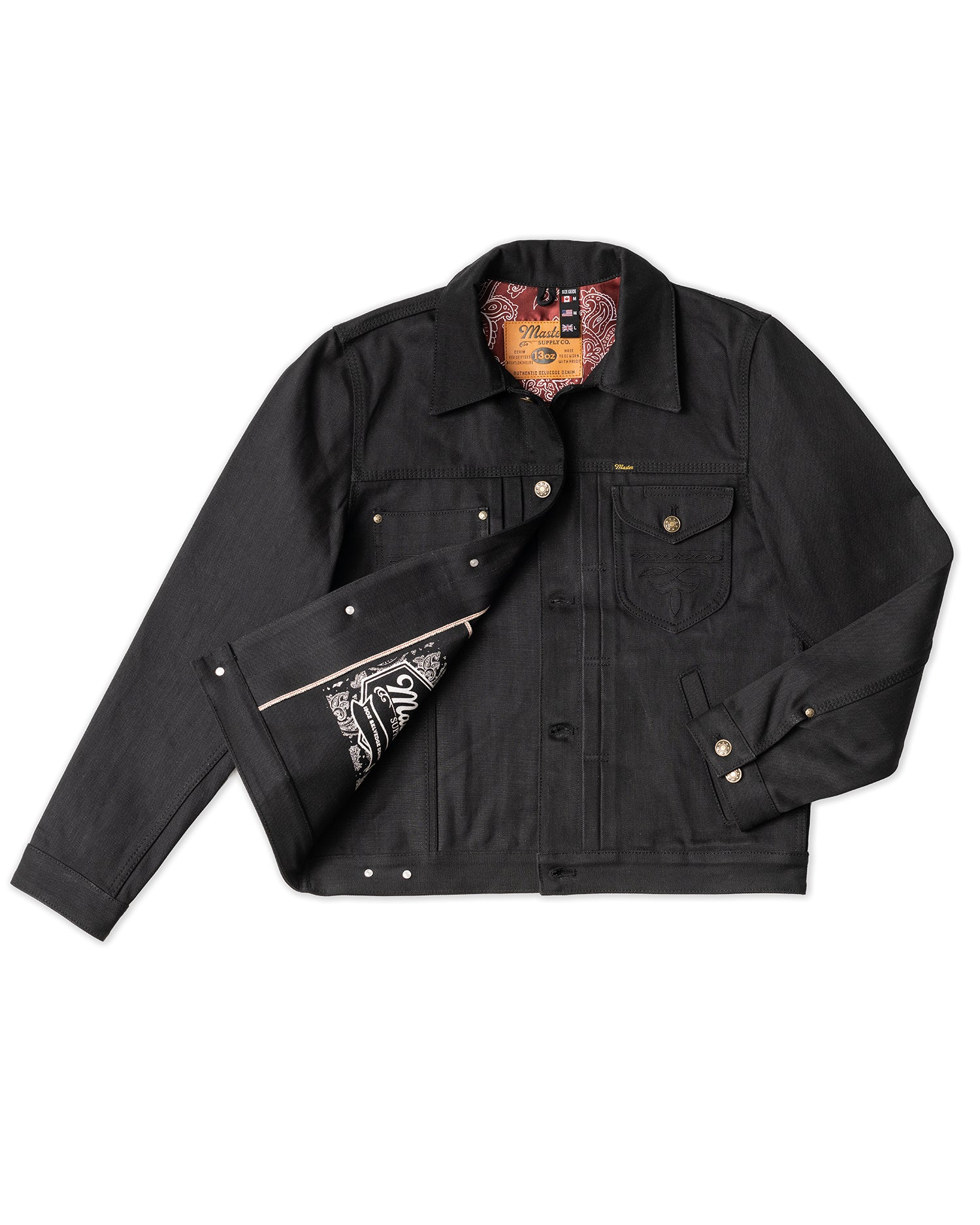 This jacket seamlessly combines functionality with a robust sense of style. Crafted with the same resilient spirit as its predecessor, the Blackjack is meticulously made from our signature 13oz selvedge denim. This black denim remains raw and exceptionally durable, maintaining its shape over time. The Blackjack proudly showcases a red line Selvedge ID, reinforced with triple-stitched seams for heightened longevity.
