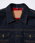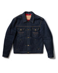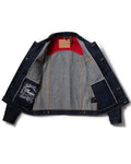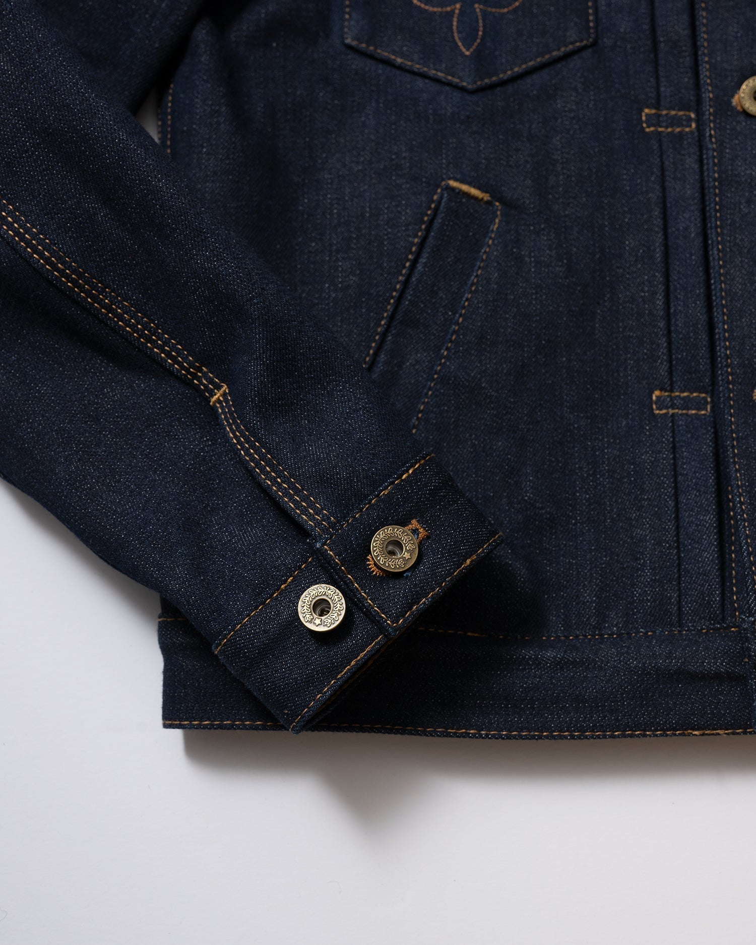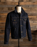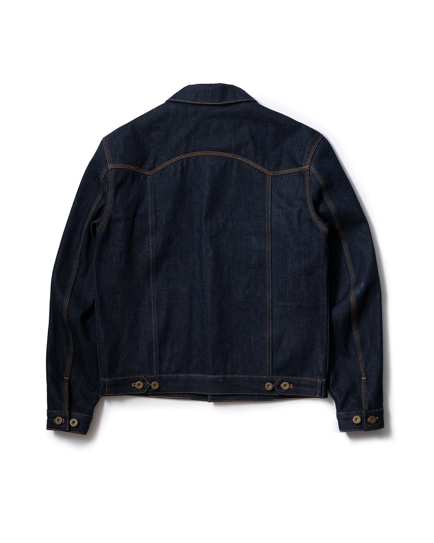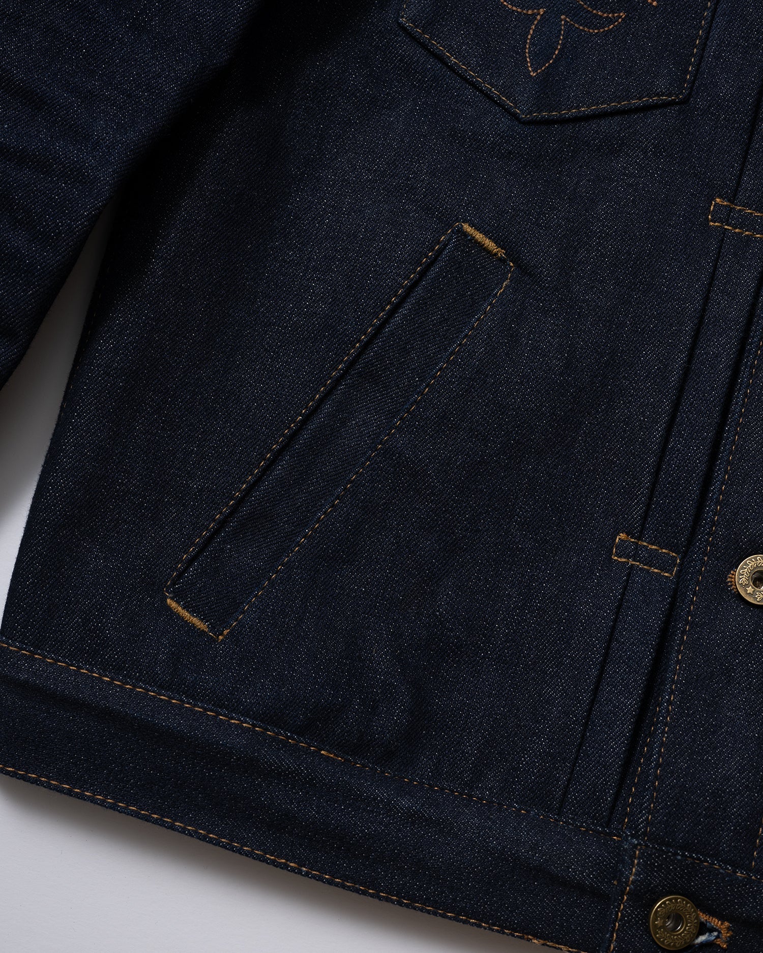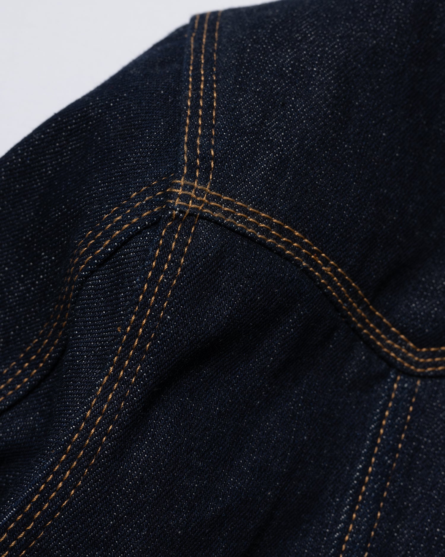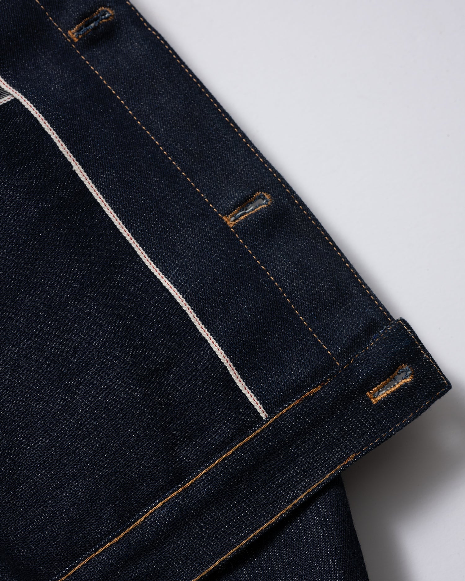 This 17 oz selvedge denim is raw and unwashed, with deep indigo saturation and a smoother hand feel thanks to its left-hand twill weave. Woven slowly on mid-century shuttle looms, each yard of fabric carries unique character and subtle irregularities that modern high-speed looms can’t replicate. Sanforization minimizes shrinkage while preserving the integrity of the break-in process. The red-line selvedge ID is a nod to denim’s heritage—and a marker of the slower, deliberate craft behind each jacket.