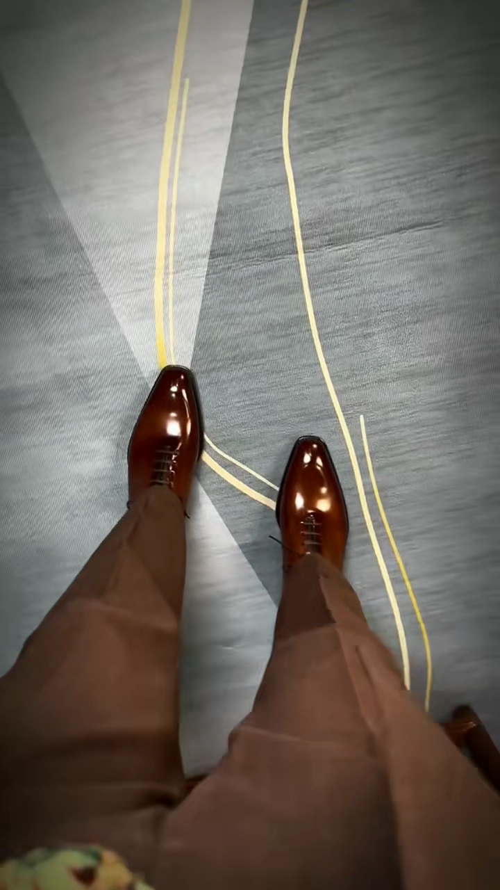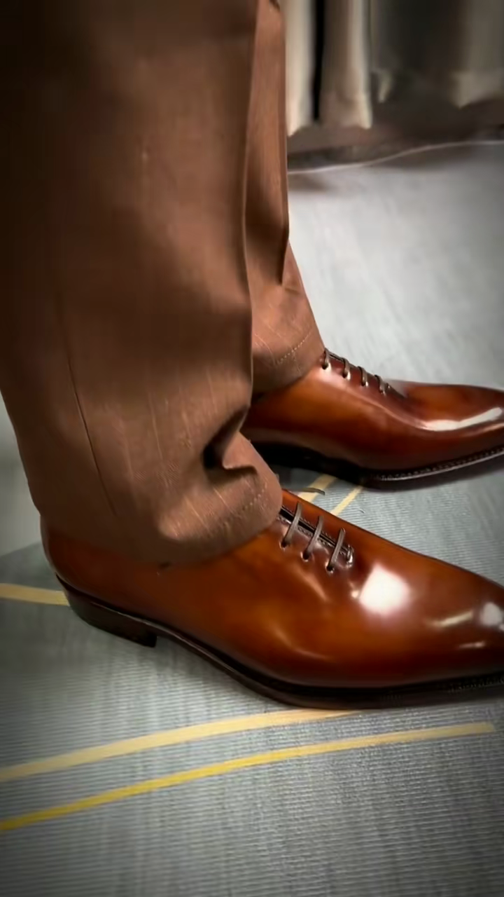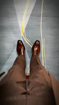 These are brown leather Oxford shoes, featuring a polished finish and classic lace - up design. Paired with black socks adorned with white polka dots and brown trousers, they exude a refined and sophisticated style. Ideal for formal occasions, business attire, or adding a touch of elegance to smart - casual looks, combining timeless craftsmanship with a polished aesthetic.
