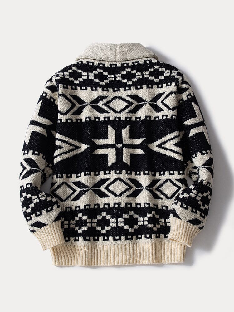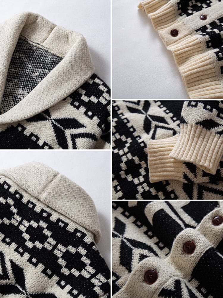 • Details: Lapel neck, button closure pattern jacquard, ribbed cuffs and hem