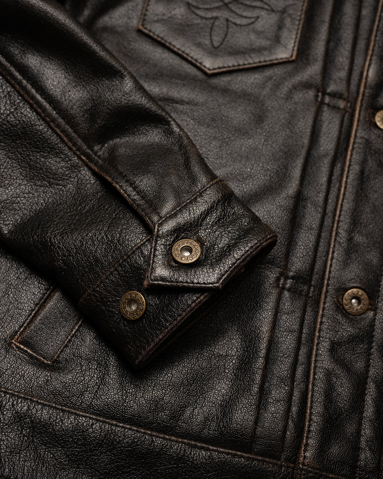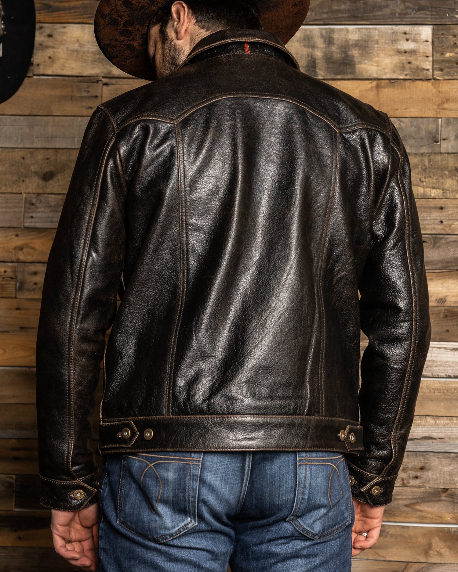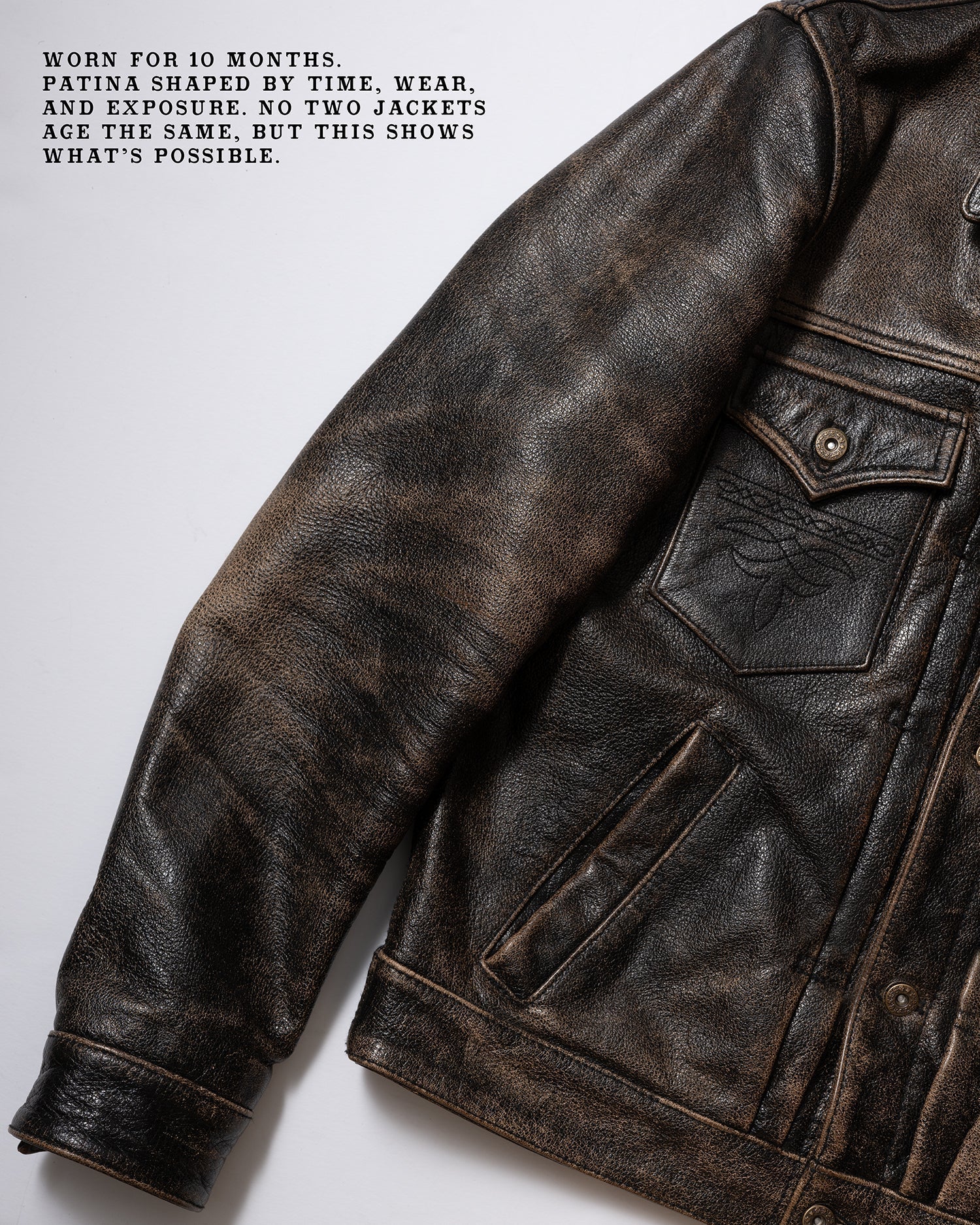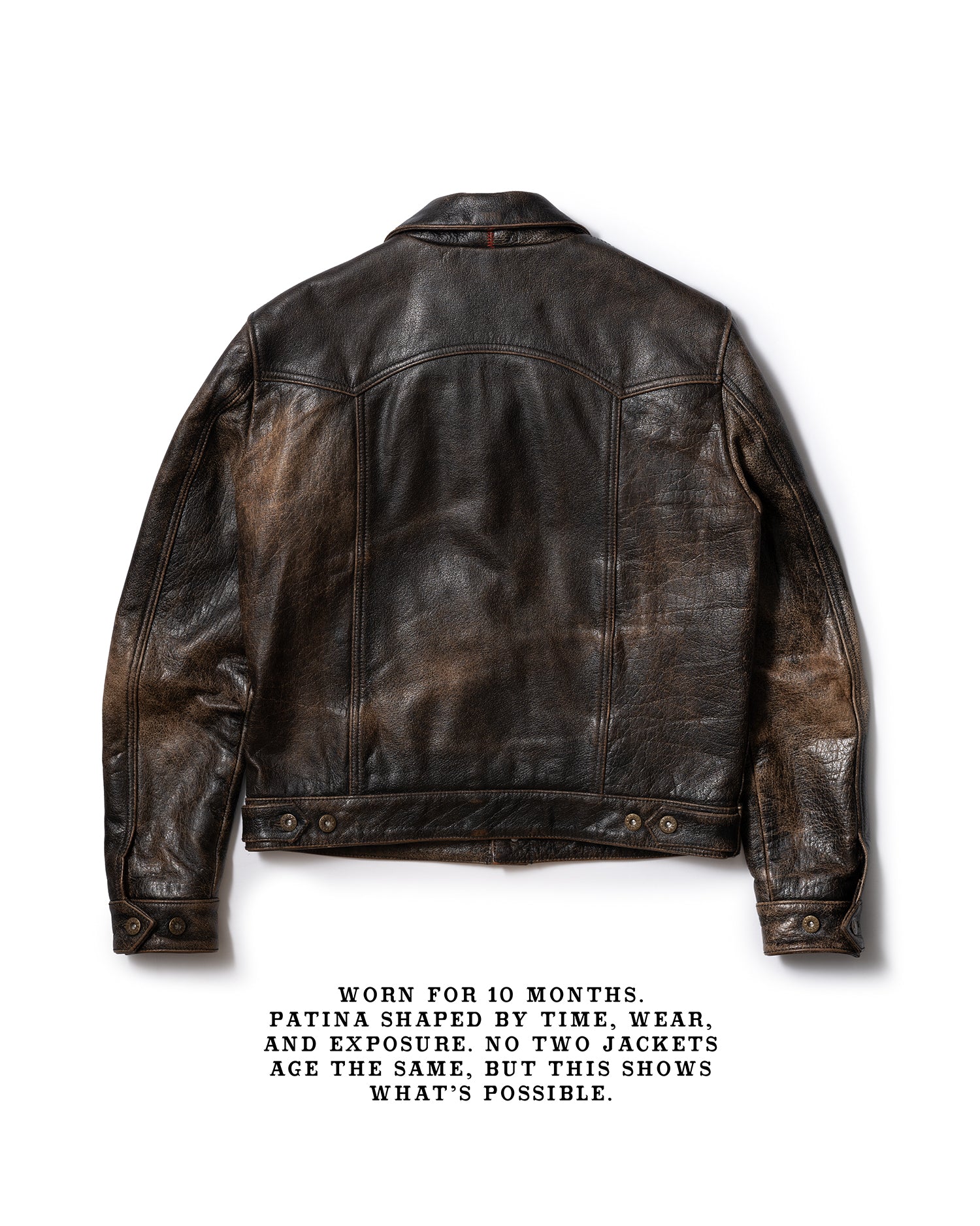 Note: The rapid patina potential of the Accelerust is a deliberate feature, ensuring that each jacket evolves uniquely with individual wear patterns. The full-grain buffalo leather is dyed a cognac brown and the exterior pigmented black. The process is designed to develop a beautiful brown core over time. The initial shine of the leather will dull as your patina develops.