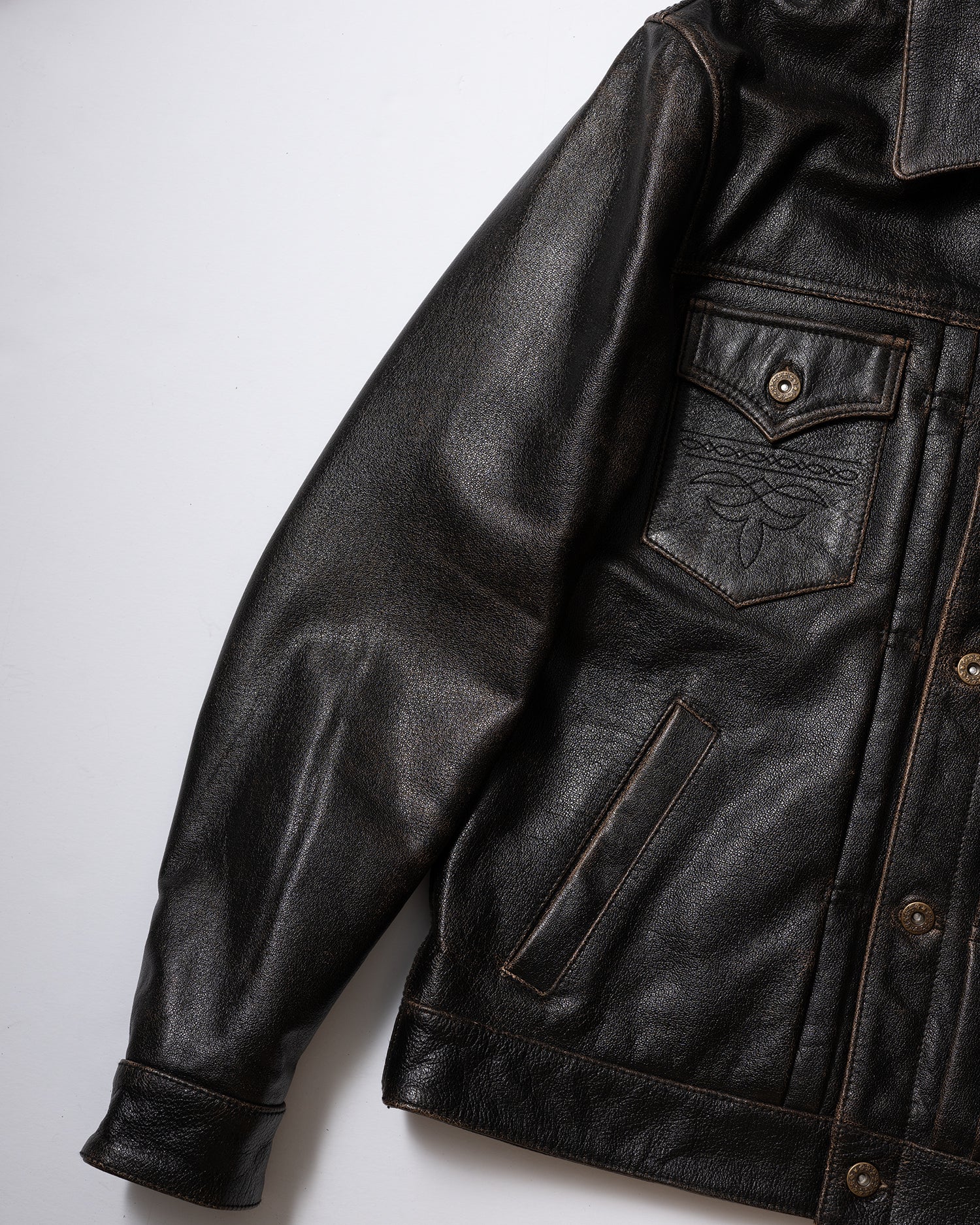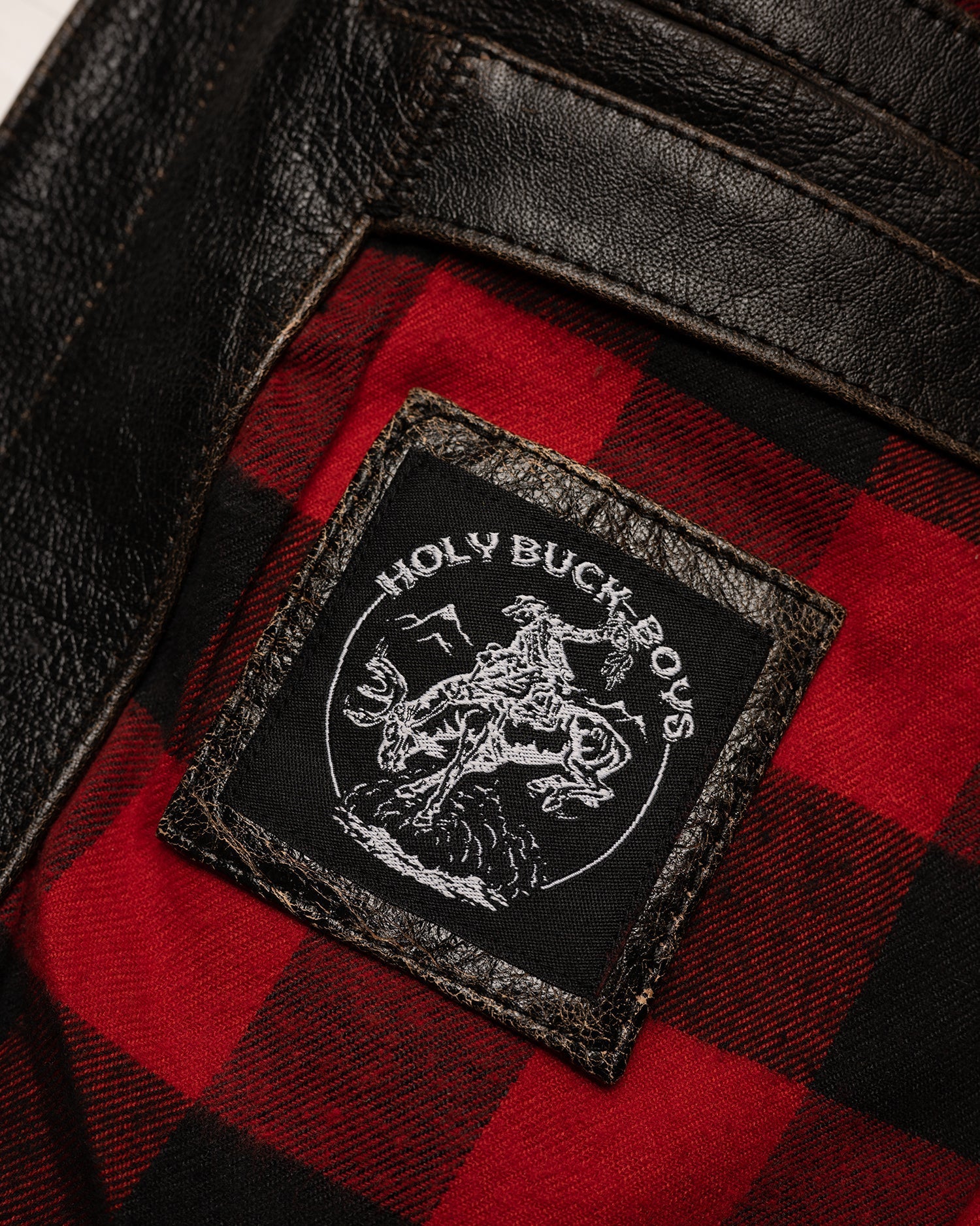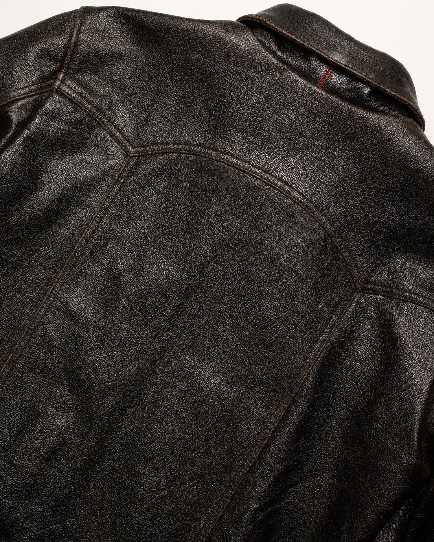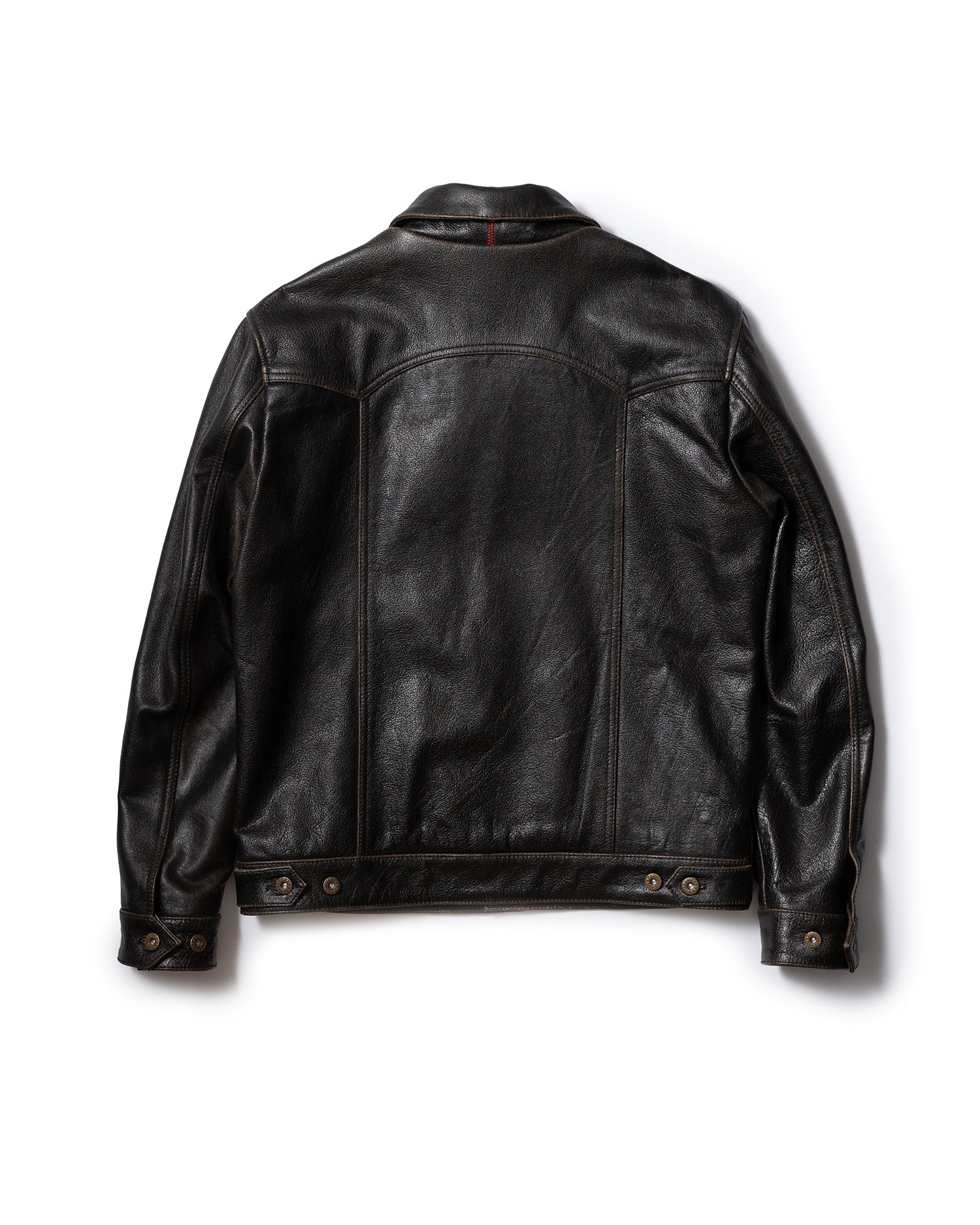 Note: The rapid patina potential of the Accelerust is a deliberate feature, ensuring that each jacket evolves uniquely with individual wear patterns. The full-grain buffalo leather is dyed a cognac brown and the exterior pigmented black. The process is designed to develop a beautiful brown core over time. The initial shine of the leather will dull as your patina develops.